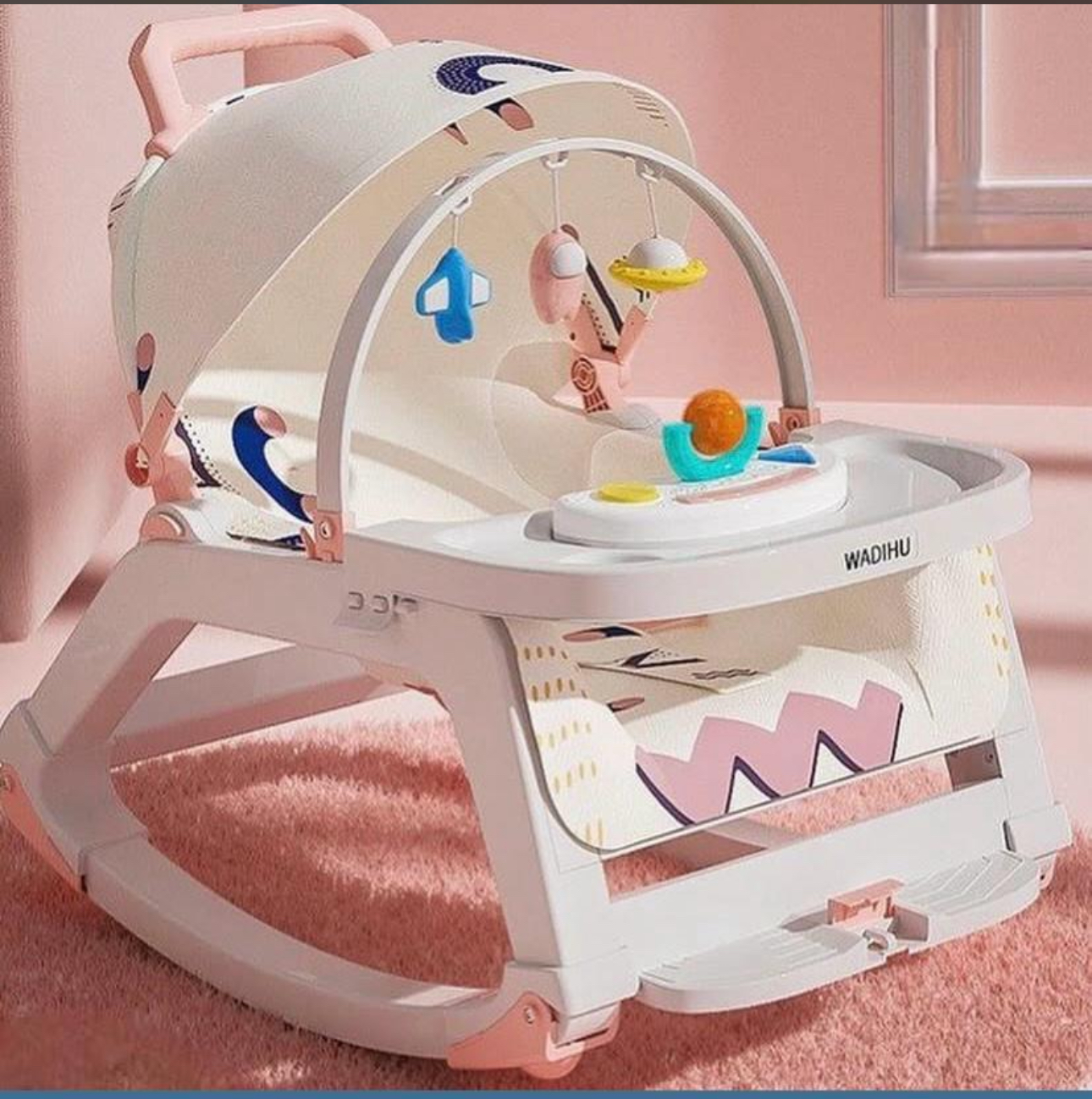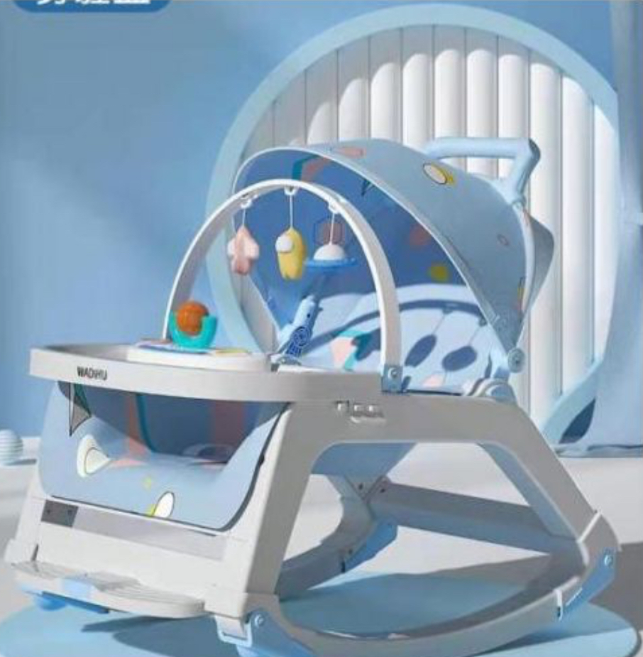 1. Multifunctional design, converting to 5 modes: rocking chair, seat, stroller, cart, and dinner table, complete with music box and toy. 2. Adjustable backrest with three positions, accommodating sitting or lying down.