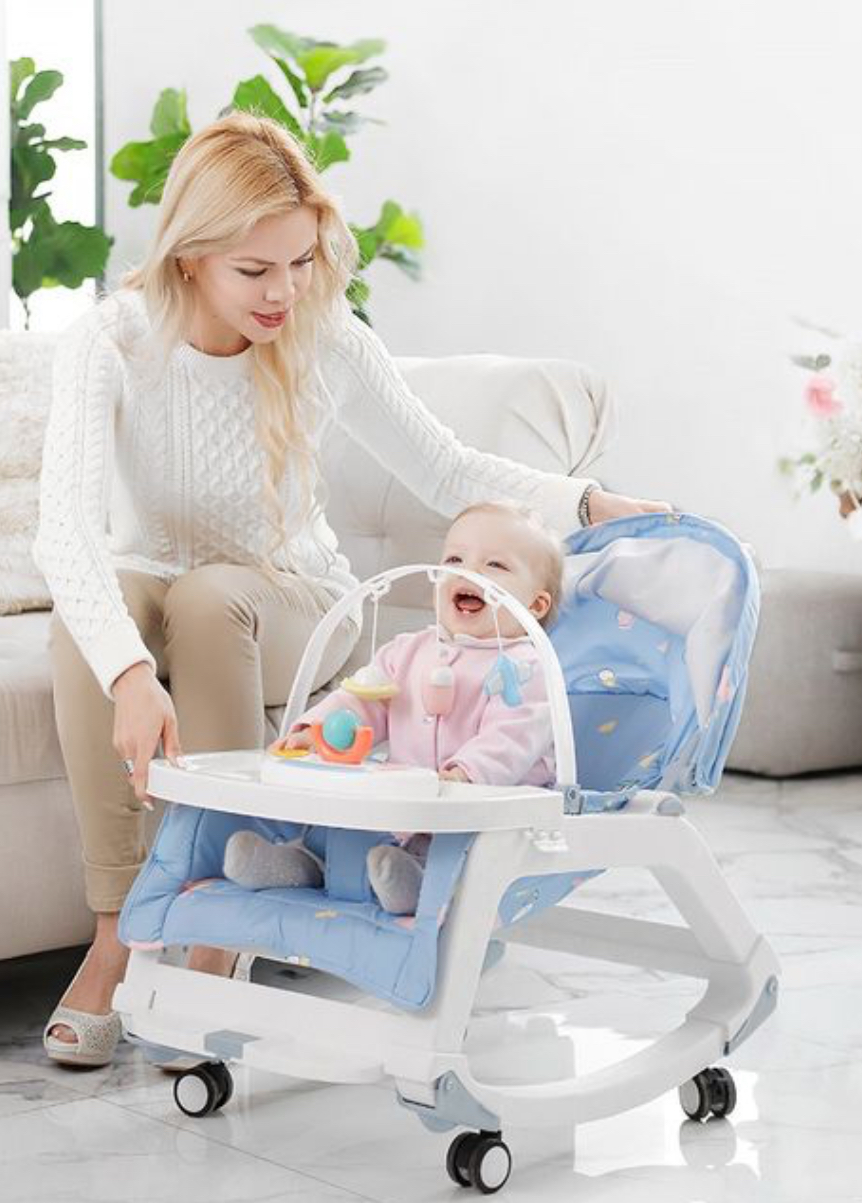 1. Effortlessly transforms into 5 modes: Rocking Chair/ Seat/ Baby Stroller/ Cart/ Dinner Table (with Music Box/ Small Toy)