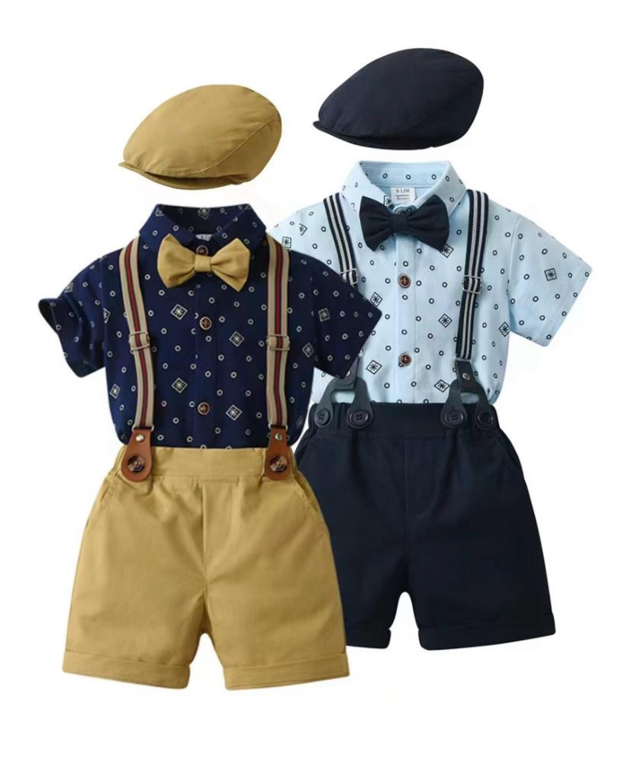 Boys’ Gentleman Outfit Set with Bow Tie , cap and Shorts, Four-Piece summer Newborn Birthday Party Dress, Sailing Pattern, Non-Stretch Fabric, Regular Sleeve, Short Sleeve, Button Details, Half Placket, Conventional Fit, for Outdoor